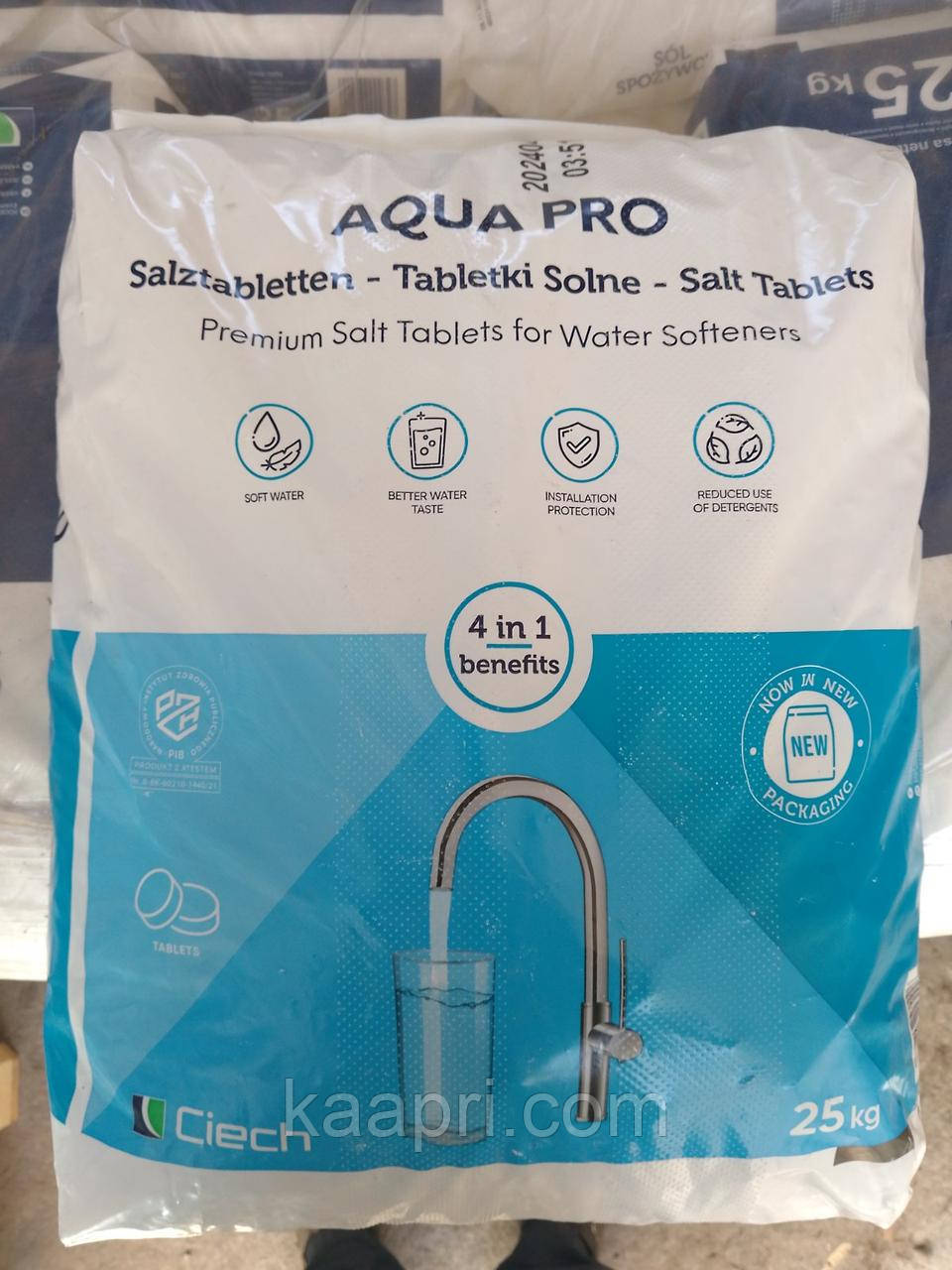 Завдяки формі у вигляді таблетки сіль, рівномірно розчиняється, зменшуючись у розмірі, що до насичення регенеруючого розчину, дозволяє позбутися від необхідності перемішувати засипану сіль, а також запобігає злежуванню та утворення нерозчинного осаду в баку-солерозчиннику.
